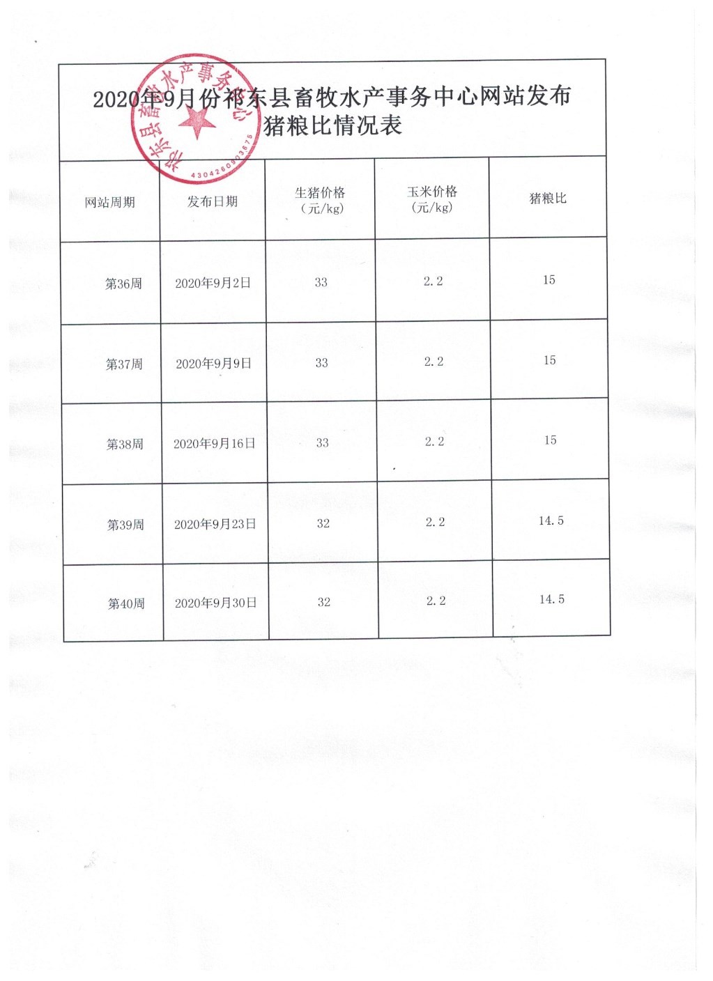 2020年9月份雷竞技app下载官方版iso畜牧水产事务中心网站发布猪粮比情况表