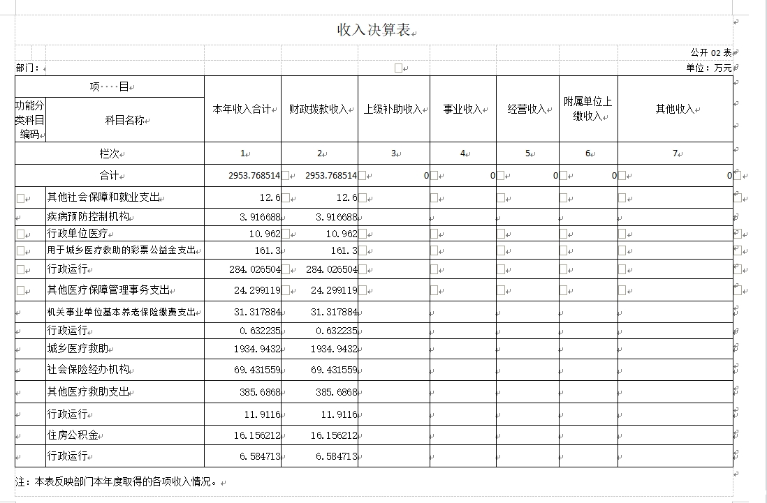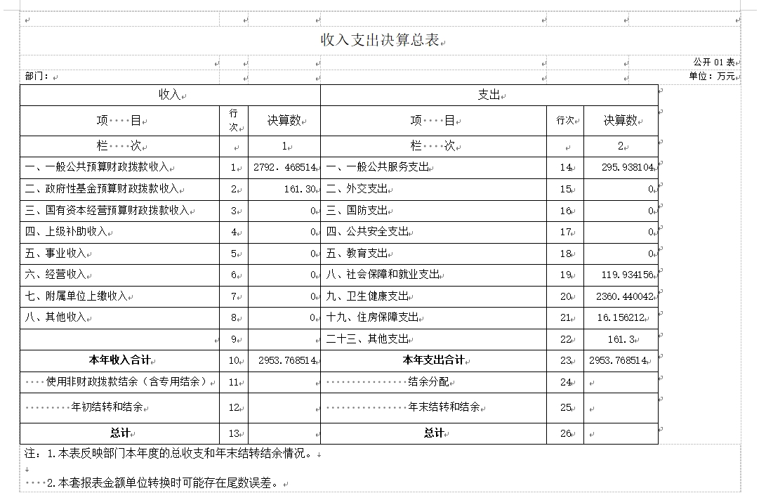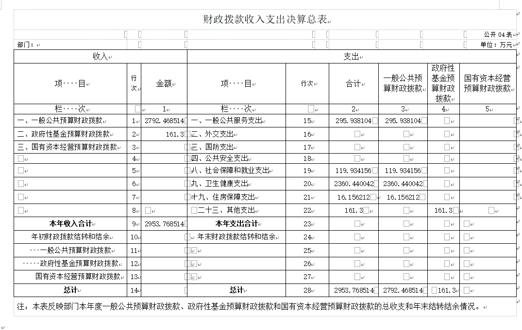2023年度收、支总计2953.768514万元。与上年相比,减少422.56万元,减少14%,主要是因为卫生健康支出减少417万元。