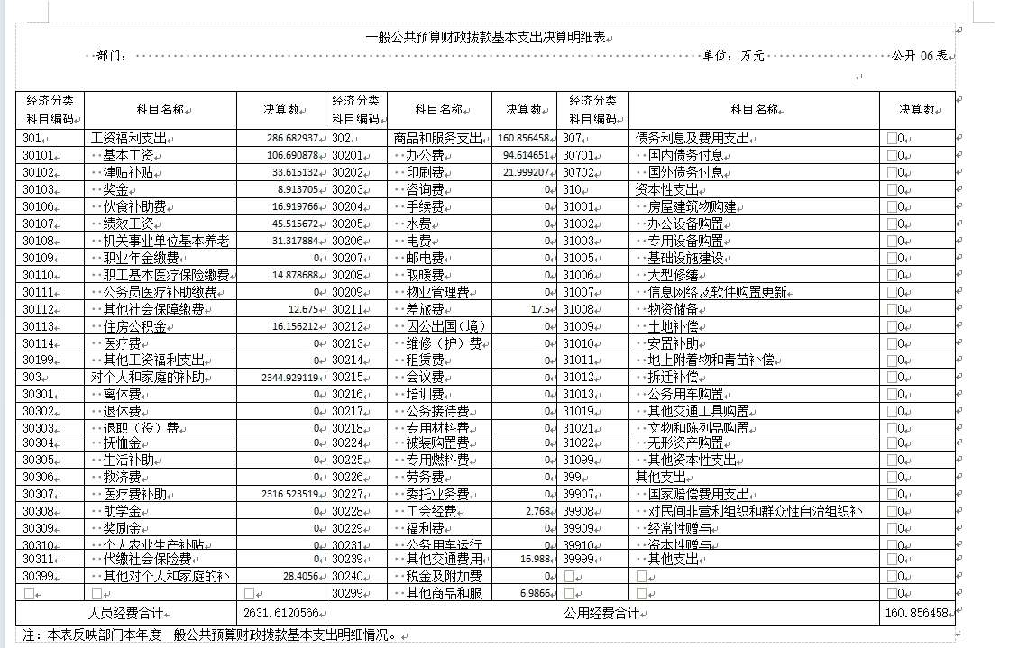 人员经费2631.612056万元,占基本支出的94.24%,主要包括基本工资、津贴补贴、奖金、伙食补助费、绩效工资、机关事业单位养老保险、职业年金、职工基本医疗保障、住房公积金、医疗费补助等。公用经费160.846458万元,占基本支出的5.76%,主要包括办公费、印刷费、咨询费、手续费、差旅费、工会经费、其他交通费用。