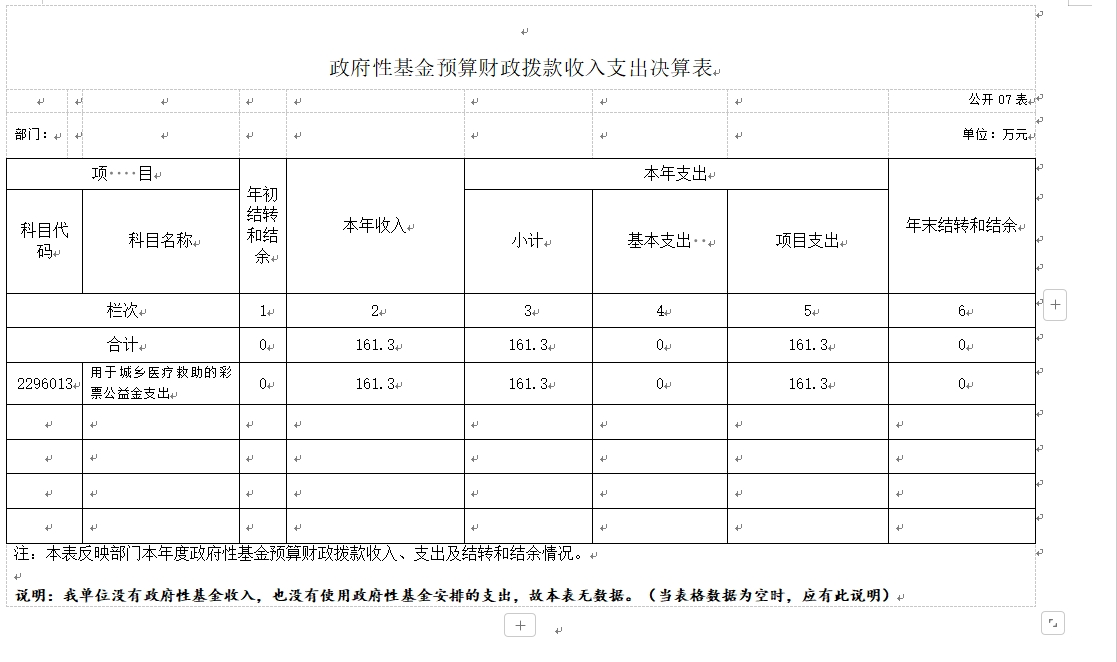 2023年度政府性基金预算财政拨款收入161.3万元;年初结转和结余0万元;支出161.3万元,其中基本支出0万元,项目支出161.3万元;年末结转和结余0万元。具体情况如下: