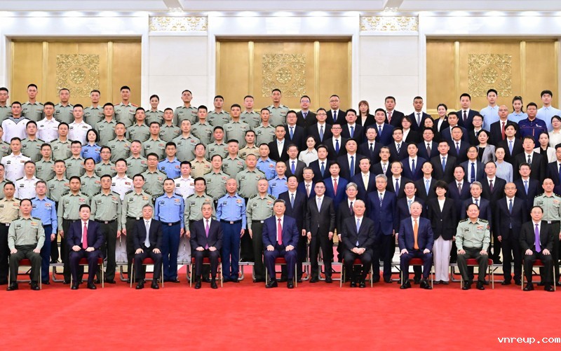 9月17日,党和国家领导人习近平、蔡奇等在北京人民大会堂接见中国人民抗日战争暨世界反法西斯战争胜利80周年纪念活动筹办工作各方面代表。