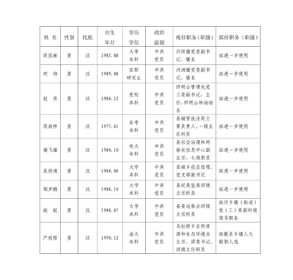 为了加强对干部选拔工作的监督,提高识别和任用干部的准确程度,现对雷竞技app下载官方版iso委常委会议研究决定的拟任人选进行任前公示: