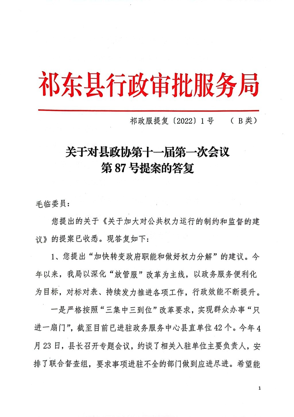 关于对县政协第十一届第一次会议第87号提案的答复