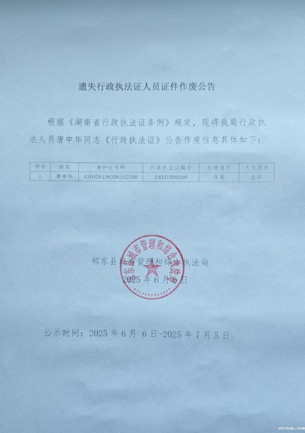 遗失行政执法证人员证件作废公告