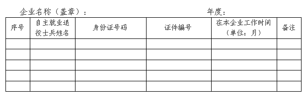企业招用自主就业退役士兵享受税收优惠政策的,将以下资料留存备查:l.招用自主就业退役士兵的《中国人民解放军退出现役证书》、《中国人民解放军义务兵退出现役证》、《中国人民解放军士官退出现役证》或《中国人民武装警察部队退出现役证书》、《中国人民武装警察部队义务兵退出现役证》、《中国人民武装警察部队士官退出现役证》;2.企业与招用自主就业退役士兵签订的劳动合同(副本),为职工缴纳的社会保险费记录;3.自主就业退役士兵本年度在企业工作时间表(见附件)。