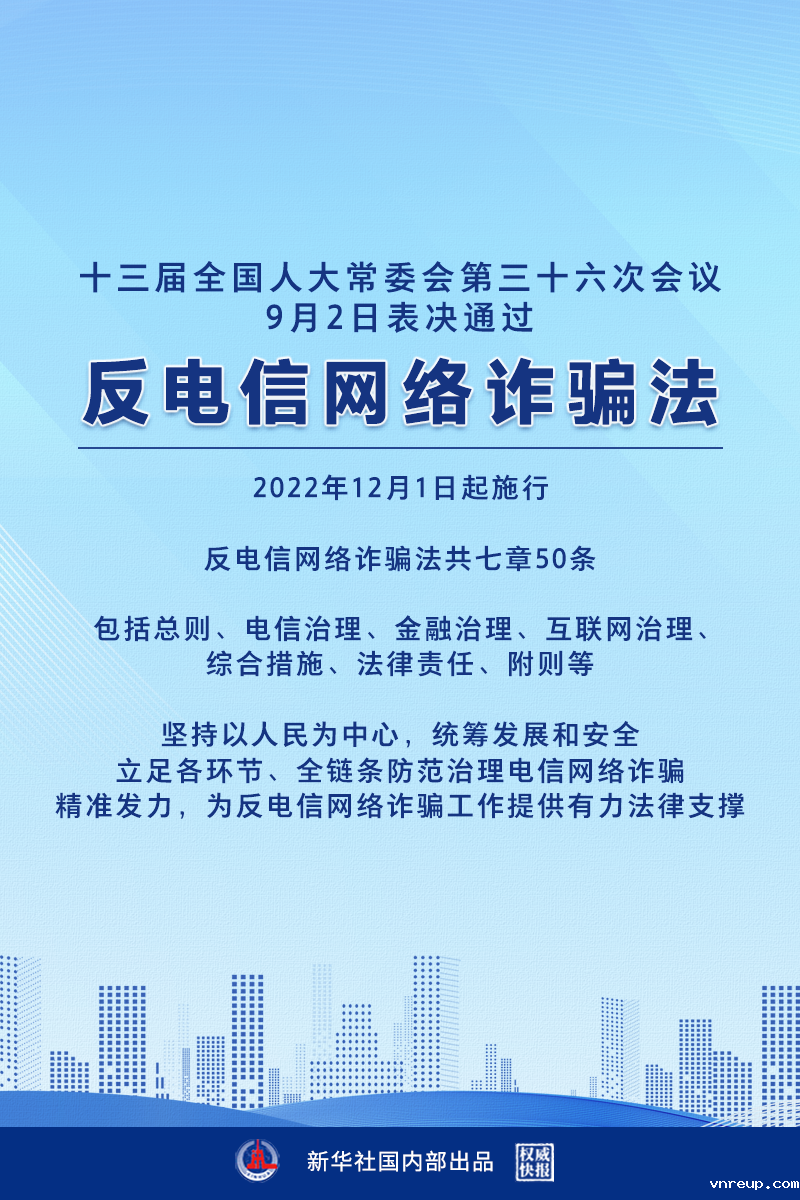 十三届全国人大常委会第三十六次会议9月2日表决通过反电信网络诈骗法。2022年12月1日起施行。 反电信网络诈骗法共七章50条,包括总则、电信治理、金融治理、互联网治理、综合措施、法律责任、附则 等,坚持以人民为中心,统筹发展和安全,立足各环节、全链条防范治理电信网络诈骗,精准发力,为反电信网络诈骗工作提供有力法律支撑。