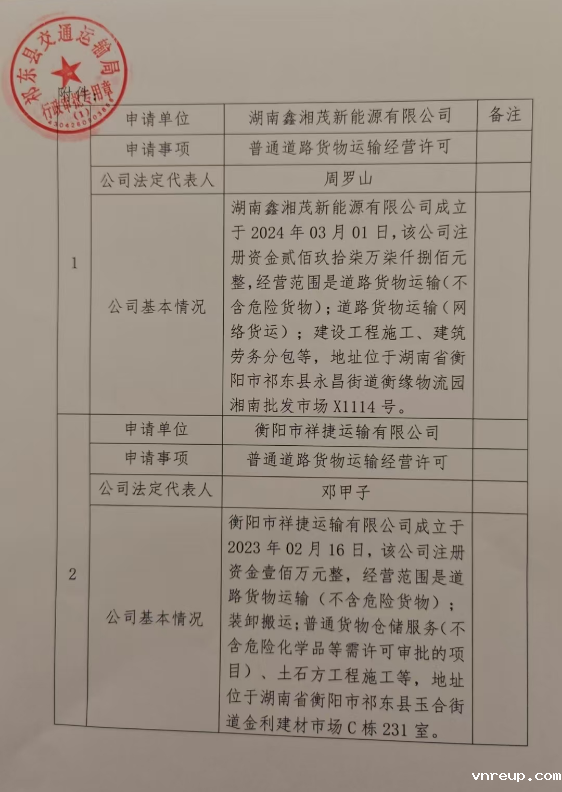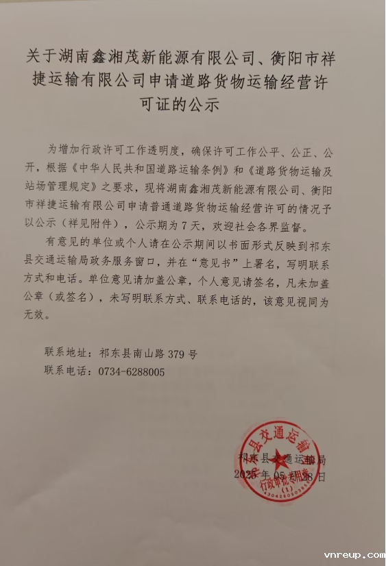 关于湖南鑫湘茂新能源有限公司、衡阳市祥捷运输有限公司申请道路货物运输经营许可证的公示
