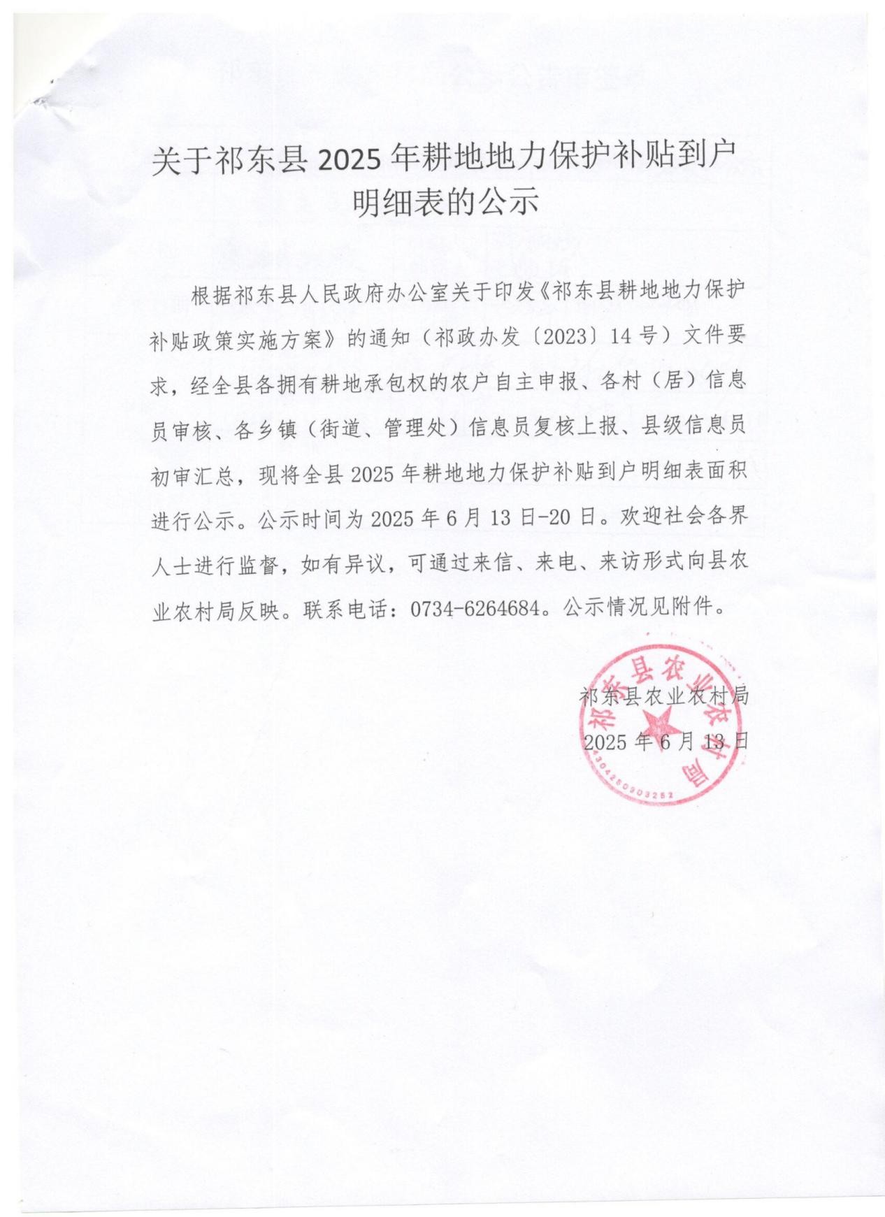 关于雷竞技app下载官方版iso2025年耕地地力保护补贴到户明细表的公示