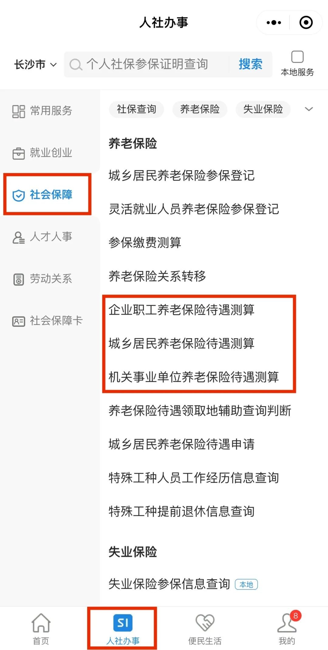 首页点击“人社办事”,在“社会保障”分类下找到“养老保险待遇测算”。