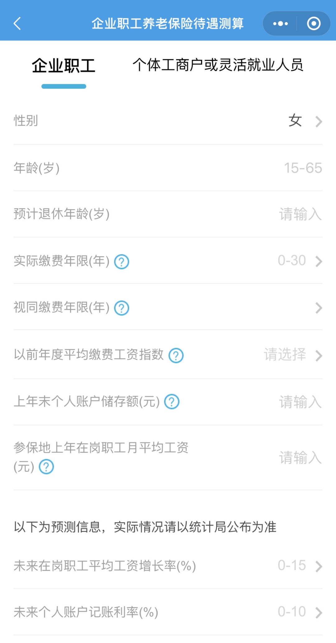 根据本人实际情况,选择企业职工养老保险待遇测算、城乡居民养老保险待遇测算、机关事业单位养老保险待遇测算,进入界面填写参数。