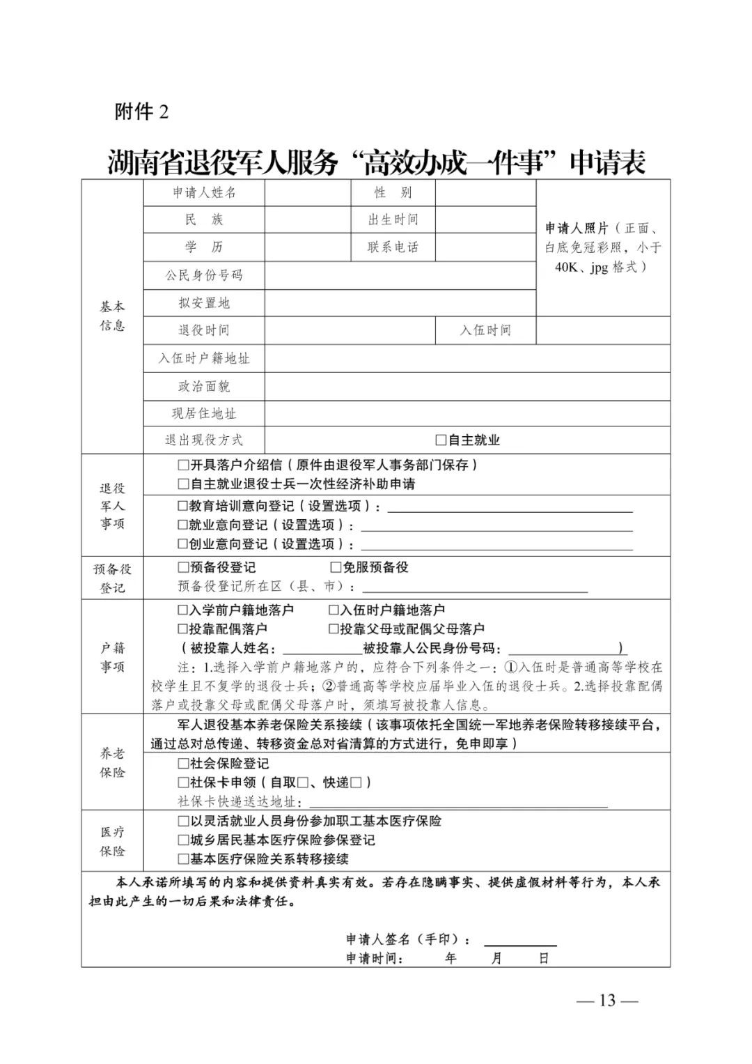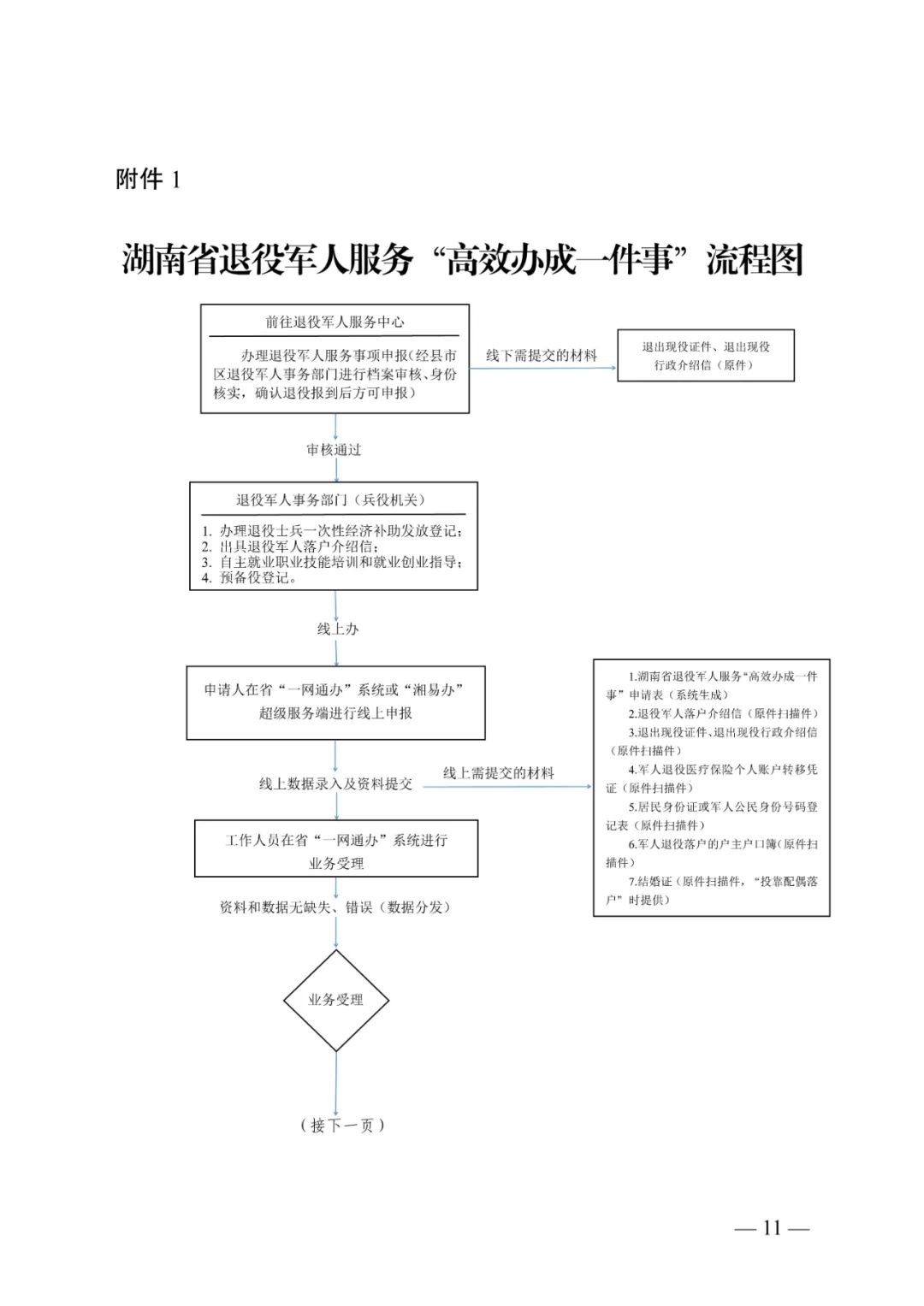 附件:1.湖南省退役军人服务"高效办成一件事"流程图2.湖南省退役军人服务"高效办成一件事"申请表3.湖南省退役军人服务"高效办成一件事"办事指南