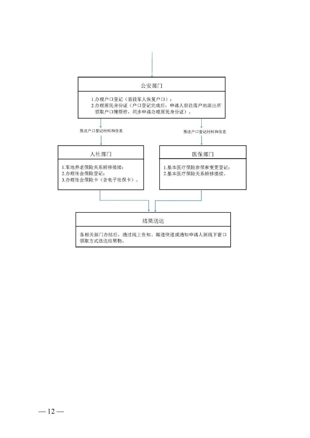 (三)公安部门:负责配合牵头部门优化再造办理流程,做好相关业务系统与退役军人服务"高效办成一件事"联办平台对接并按要求共享流转相关数据;负责办理退役军人户口登记(退役军人恢复户口)、居民身份证制发。