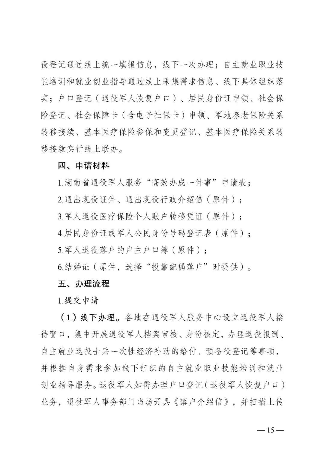 1.提交申请(1)线下办理。各地在退役军人服务中心设立退役军人接待窗口,集中开展退役军人档案审核、身份核定,办理退役报到、自主就业退役士兵一次性经济补助的给付、预备役登记等事项,并根据自身需求参加线下组织的自主就业职业技能培训和就业创业指导服务。退役军人如需办理户口登记(退役军人恢复户口)业务,退役军人事务部门当场开具《落户介绍信》,并扫描上传至省"一网通办"系统。(2)线上受理。依托省"一网通办"系统和"湘易办"超级服务端,在"高效办成一件事"专区设置退役军人服务"一件事"办事入口,申请人在线下办理退役报到等事项后,完成线上用户注册登录,在"高效办成一件事"办事入口录入申请人基本信息、《湖南省退役军人服务"高效办成一件事"申请表》表单信息,一次性提交线上联办事项所需材料。