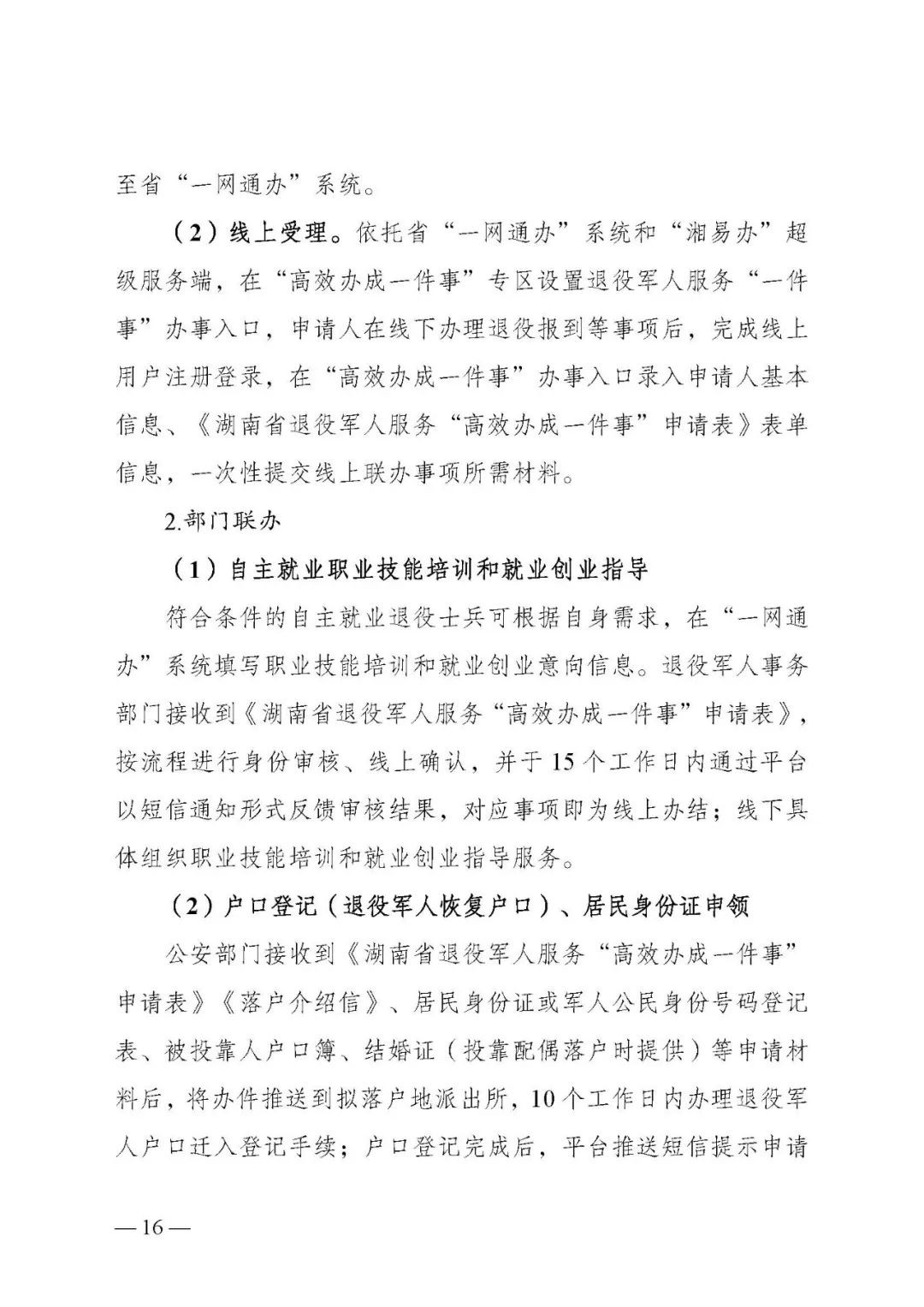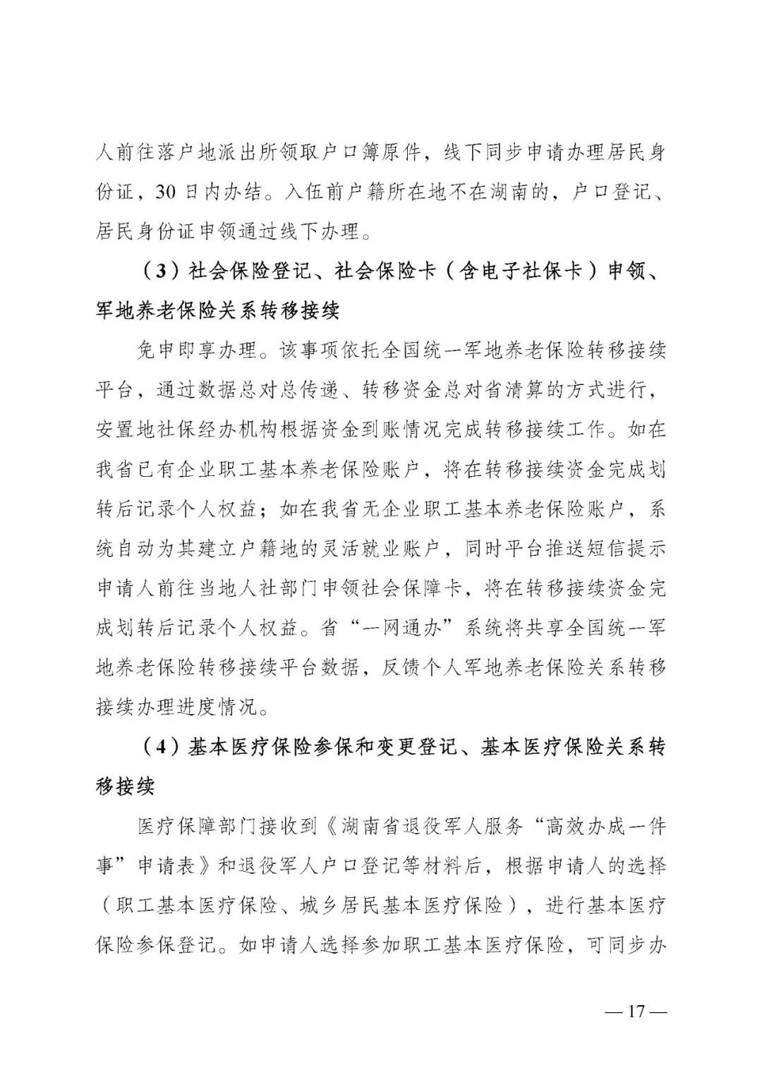 3.部门联办(1)自主就业职业技能培训和就业创业指导符合条件的自主就业退役士兵可根据自身需求,在"一网通办"系统填写职业技能培训和就业创业意向信息。退役军人事务部门接收到《湖南省退役军人服务"高效办成一件事"申请表》,按流程进行身份审核、线上确认,并于15个工作日内通过平台以短信通知形式反馈审核结果,对应事项即为线上办结;线下具体组织职业技能培训和就业创业指导服务。(2)户口登记(退役军人恢复户口)、居民身份证申领公安部门接收到《湖南省退役军人服务"高效办成一件事"申请表》《落户介绍信》、居民身份证或军人公民身份号码登记表、被投靠人户口簿、结婚证(投靠配偶落户时提供)等申请材料后,将办件推送到拟落户地派出所,10个工作日内办理退役军人户口迁入登记手续;户口登记完成后,平台推送短信提示申请人前往落户地派出所领取户口簿原件,线下同步申请办理居民身份证,30日内办结。入伍前户籍所在地不在湖南的,户口登记、居民身份证申领通过线下办理。(3)社会保险登记、社会保险卡(含电子社保卡)申领、军地养老保险关系转移接续免申即享办理。该事项依托全国统一军地养老保险转移接续平台,通过数据总对总传递、转移资金总对省清算的方式进行,安置地社保经办机构根据资金到账情况完成转移接续工作。如在我省已有企业职工基本养老保险账户,将在转移接续资金完成划转后记录个人权益;如在我省无企业职工基本养老保险账户,系统自动为其建立户籍地的灵活就业账户,同时平台推送短信提示申请人前往当地人社部门申领社会保障卡,将在转移接续资金完成划转后记录个人权益。省"一网通办"系统将共享全国统一军地养老保险转移接续平台数据,反馈个人军地养老保险关系转移接续办理进度情况。(4)基本医疗保险参保和变更登记、基本医疗保险关系转移接续医疗保障部门接收到《湖南省退役军人服务"高效办成一件事"申请表》和退役军人户口登记等材料后,根据申请人的选择(职工基本医疗保险、城乡居民基本医疗保险),进行基本医疗保险参保登记。如申请人选择参加职工基本医疗保险,可同步办理基本医疗保险关系转移接续。