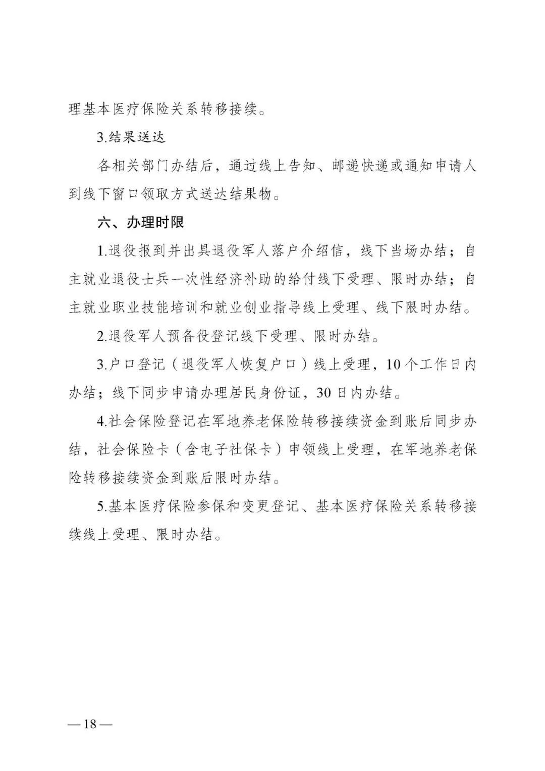 (三)办理方式退役报到、自主就业退役士兵一次性经济补助的给付、预备役登记通过线上统一填报信息,线下一次办理;自主就业职业技能培训和就业创业指导通过线上采集需求信息、线下具体组织落实;户口登记(退役军人恢复户口)、居民身份证申领、社会保险登记、社会保障卡(含电子社保卡)申领、军地养老保险关系转移接续、基本医疗保险参保和变更登记、基本医疗保险关系转移接续实行线上联办。