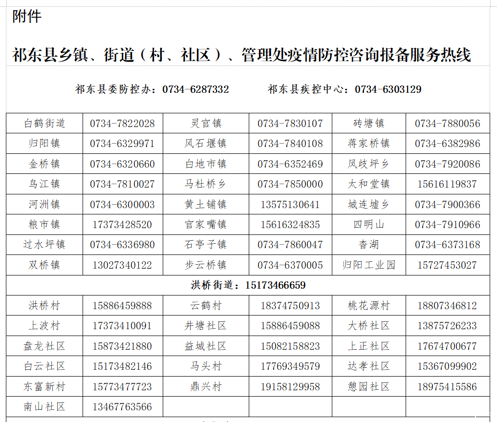 二、严格落实入祁报备。临近年末,随着人员流动频繁,新冠病毒感染、传播风险也将同步增大,为了您及亲朋好友的健康,请您做到非必要不返祁,若确需返乡且从外省和本省7天内有疫情发生地市州入(返)祁,请至少提前1天通过湖南省居民健康卡"返湘报备"或咨询报备服务热线(详见附件),向目的地村(社区)如实报备旅居史、接触史、健康状况等相关情况;未提前报备的,须在火车站、汽车站、高速等第一入祁点进行现场报备。近7天内有涉疫地区旅居史及红码、黄码人员,请密切关注疫情动态,通过"健康衡阳"公众号及有关媒体查阅"存在社区传播风险地区",一旦发现本人及家人的行程轨迹同涉疫场所或阳性感染者有交集,须立即向所在社区(村)、单位或酒店、宾馆报告,按要求落实防控措施。