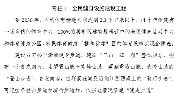 1.不断完善基本公共体育服务体系。创新公共体育服务体制机制,积极探索公共体育服务新方式,加快建设构建标准较高、内容完备、惠及全民的基本公共体育服务体系。制定我省公共体育服务标准,支持各市州制定与当地经济社会发展水平相适应且具有地域特色的地方标准,建立基本公共体育服务标准动态调整机制。积极开展体育强省、全民运动健身模范市和全民运动健身模范县三级联创活动,逐步推动基本公共体育服务在地区、城乡、行业和人群间的均等化。坚持普惠性、保基本、兜底线、可持续的原则,提高我省公共体育服务水平,加快发展全民健身事业。统筹城乡公共体育设施布局,均衡配置公共体育资源,实现农村、城市社区公共体育服务资源互联互通。推进“全民健身行动”,助力健康湖南建设。全面落实《湖南省全民健身条例》,把全民健身事业纳入省、市州、县市区国民经济和社会发展规划,全民健身经费纳入各级财政预算,全民健身工作纳入各级政府目标管理。全民健身经费随国民经济水平提升逐步增长。推进政府购买体育健身服务,鼓励商业保险机构开发与全民健身相关的保险业务。依托专业体育医疗机构和运动休闲基地探索建立运动康复产业园。积极探索建立政府与民间、专业与业余相结合的户外运动求助体系。