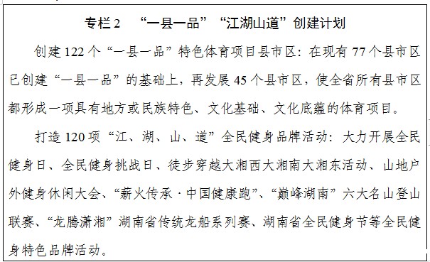 创建“一县一品”全民健身主题特色品牌活动。打造“江(湘、资、沅、澧等)、湖(洞庭湖、东江湖、柳叶湖、清江湖等)、山(武陵山脉、雪峰山脉、崀山、衡山等)、道(潇湘健身步道、茶马古道、岩道水道驿道等)”四个具有湖南特色的全民健身活动品牌。以2022年北京冬奥会、国家体育总局实施“带动三亿人参与冰雪运动”和“北冰南展西扩东进”计划为契机,推动湖南百万青少年参与冰雪运动。