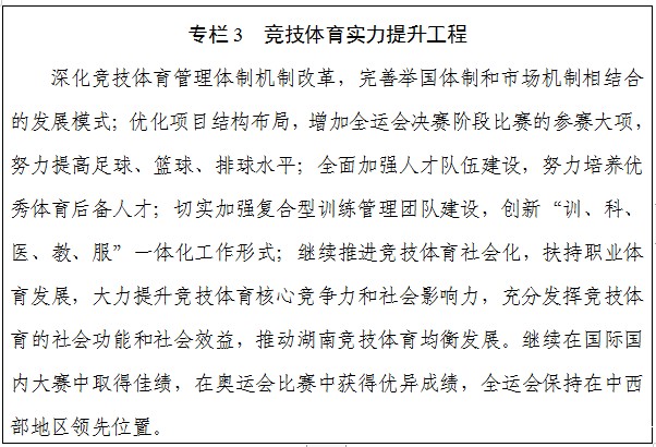 竞技体育综合实力不断增强。体教融合持续推进,青少年体育后备人才培养体系不断完善,业余训练质量明显提高。项目结构不断优化,参加全运会决赛阶段比赛的项目数量由目前的16个左右提升至21个左右,职业体育发展水平明显提升。争取10名以上运动员参加奥运会4—8个项目的比赛,在奥运会比赛中获得优异成绩。全运会保持中西部地区领先位置。竞技体育综合实力与全省经济社会发展水平相适应。