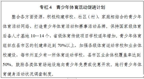 1.以学校为重点,深入开展青少年体育活动。深化体教融合,实施青少年体育活动促进计划,广泛开展丰富多样的青少年公益体育活动和运动项目技能培训,促进青少年养成良好体育习惯,掌握一项以上体育运动技能。加大青少年体育活动场地设施建设力度,开发适合青少年特点的运动器械、锻炼项目和健身方法。打造全国青少年体育冬夏令营样板工程,广泛开展“青少年阳光体育运动”系列活动,切实保障中小学体育课课时,确保学生校内每天体育活动时间不少于一小时。对照《国家学生体质健康标准》,推行测试报告书制度和公告制度。因地施教开展各类体育活动,大力推广足球、篮球、排球等学生喜欢的体育项目,扩大校园覆盖面,提升青少年体质健康水平。广泛开展学校体育赛事活动,探索利用学校资源承办高水平青少年体育竞赛。