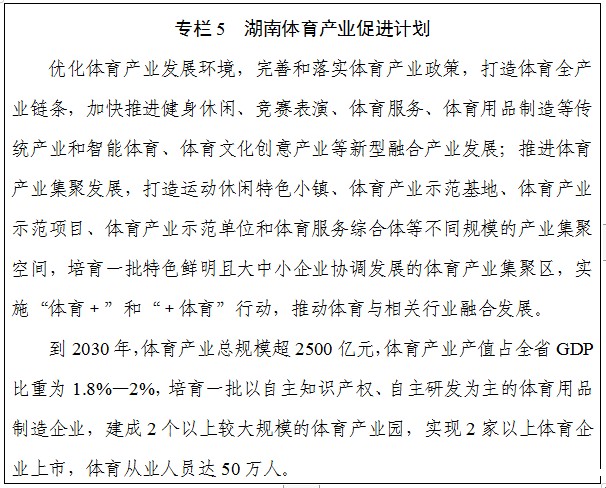 1.打造完备的体育产业体系。加快形成“功能完善、门类齐全、产品丰富、服务优质、具有湖南特色”的体育产业体系,实现体育产业提档升级。大力开发竞赛表演市场,培育若干个具有较大影响力的本土化国际国内品牌体育赛事,重视职业体育赛事的品牌运营;大力发展传统型体育运动项目和具有消费引领型的新兴体育健身项目,有效扩大体育健身休闲产业市场供给;大力发展运动员经纪、赛事组织、体育信息咨询等中介服务业,培育一批运作规范、信誉好、竞争力强的体育中介服务机构。培育一批以生产户外体育用品、体育服装、体育健身器械为主的体育用品制造企业,树立“湖南制造”“湖南智造”品牌形象。
