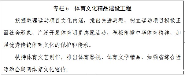 体育文化影响力大幅提升。保护传承优秀体育传统文化,培育运动项目文化,打造一批社会效益显著的体育文化品牌活动,大力弘扬以爱国主义为核心的中华体育精神,传播奥林匹克文化,把丰富多彩的体育文化理念融入到体育事业发展的各个环节。