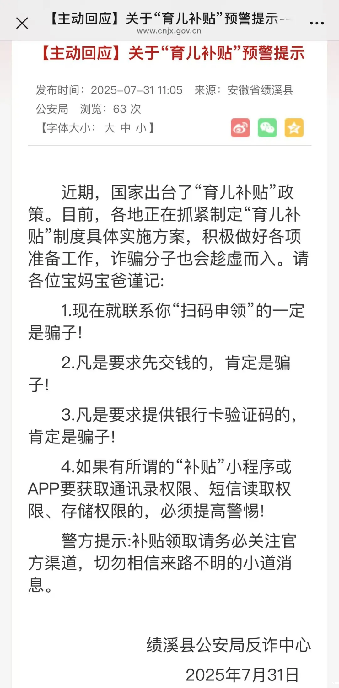 △安徽绩溪县公安局7月31日发布关于育儿补贴的预警提示。