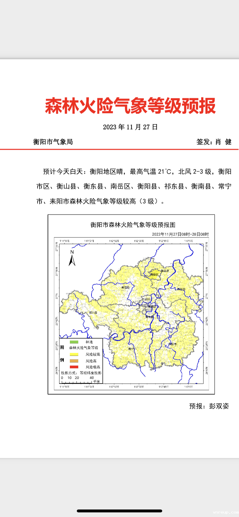 根据市气象局对11月27日森林火险气象等级预报,市森林防灭火指挥部发布森林火险黄色预警:预计今天白天衡阳市区、衡东县、衡山县、南岳区、衡阳县、雷竞技app下载官方版iso、衡南县、常宁市、耒阳市森林火险气象等级较高,请按森林火灾应急预案规定,启动黄色预警响应措施:加强防火值班调度,加强野外火源管理,加强森林防火巡护和了望监测,加强火险隐患排查,落实防火装备物资,县乡两级森林消防队伍进入待命状态。