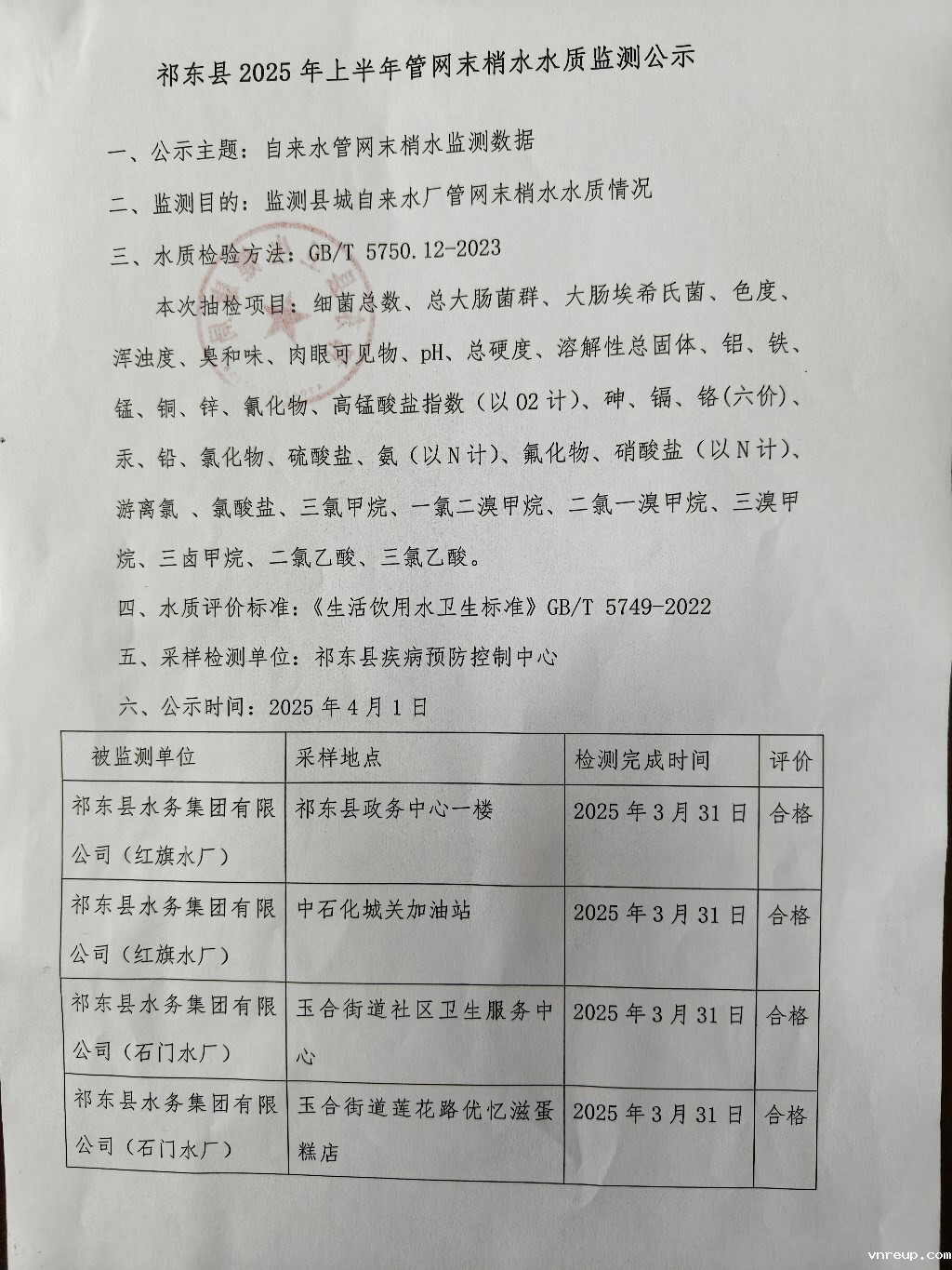 雷竞技app下载官方版iso2025年上半年管末梢水水质监测公示