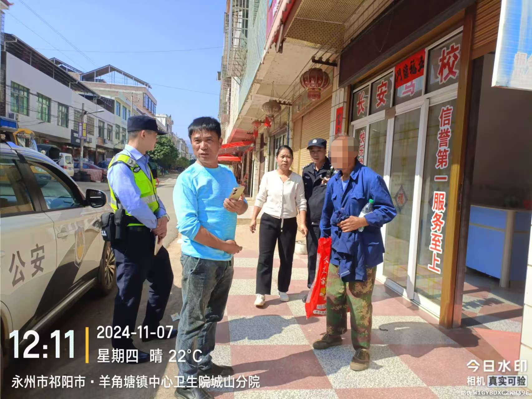 11月7日,灵官派出所交警中队在辖区巡逻时,听到群众说,在大和山村村部旁边有老人在流浪,副所长邓建军得知情况后立即驱车前往,到达现场后发现系一男性老人,说不出自己的家庭住址,后通过查询老人系祁阳市羊角塘镇黄坪村人,名叫黄某安。